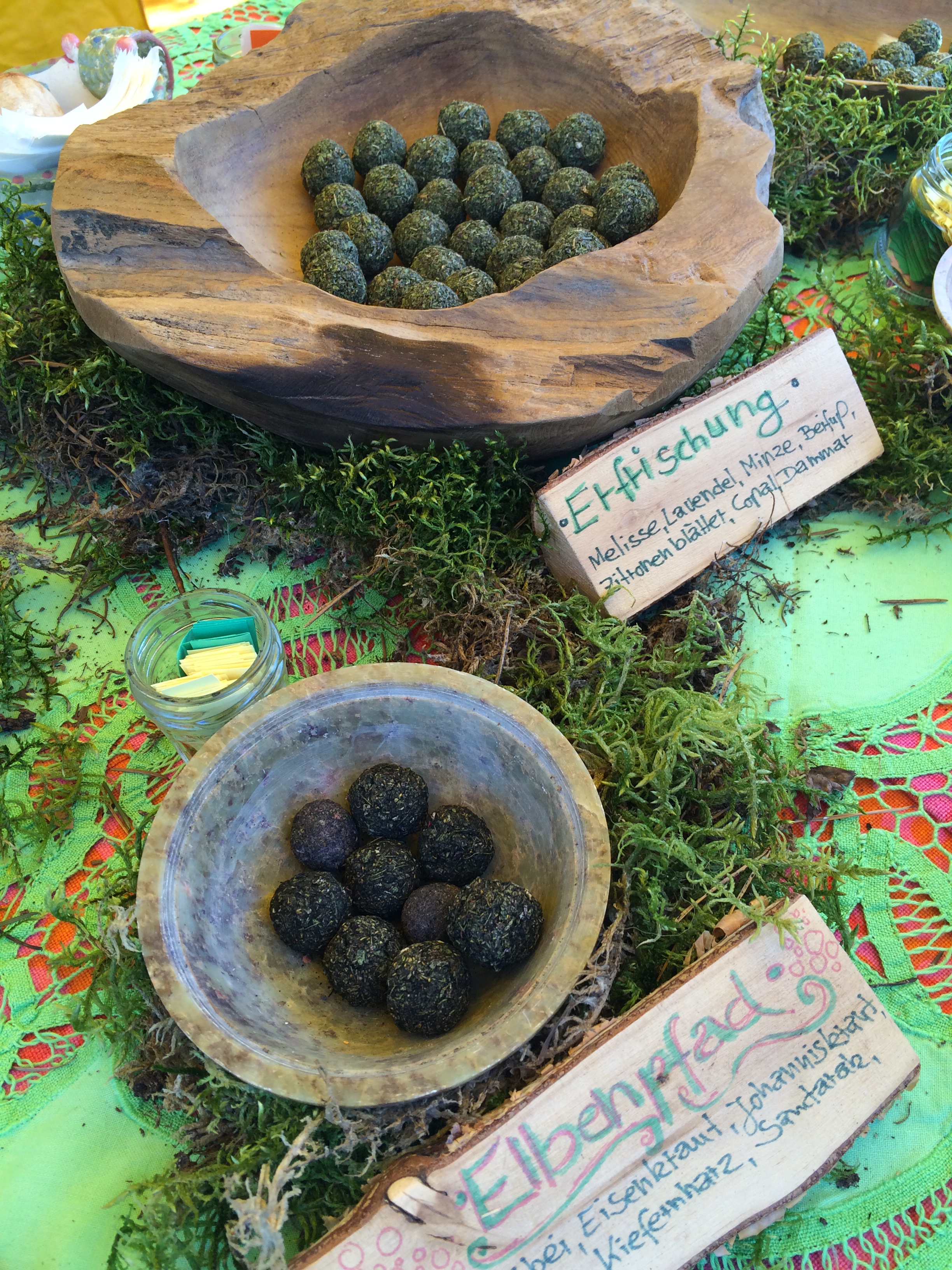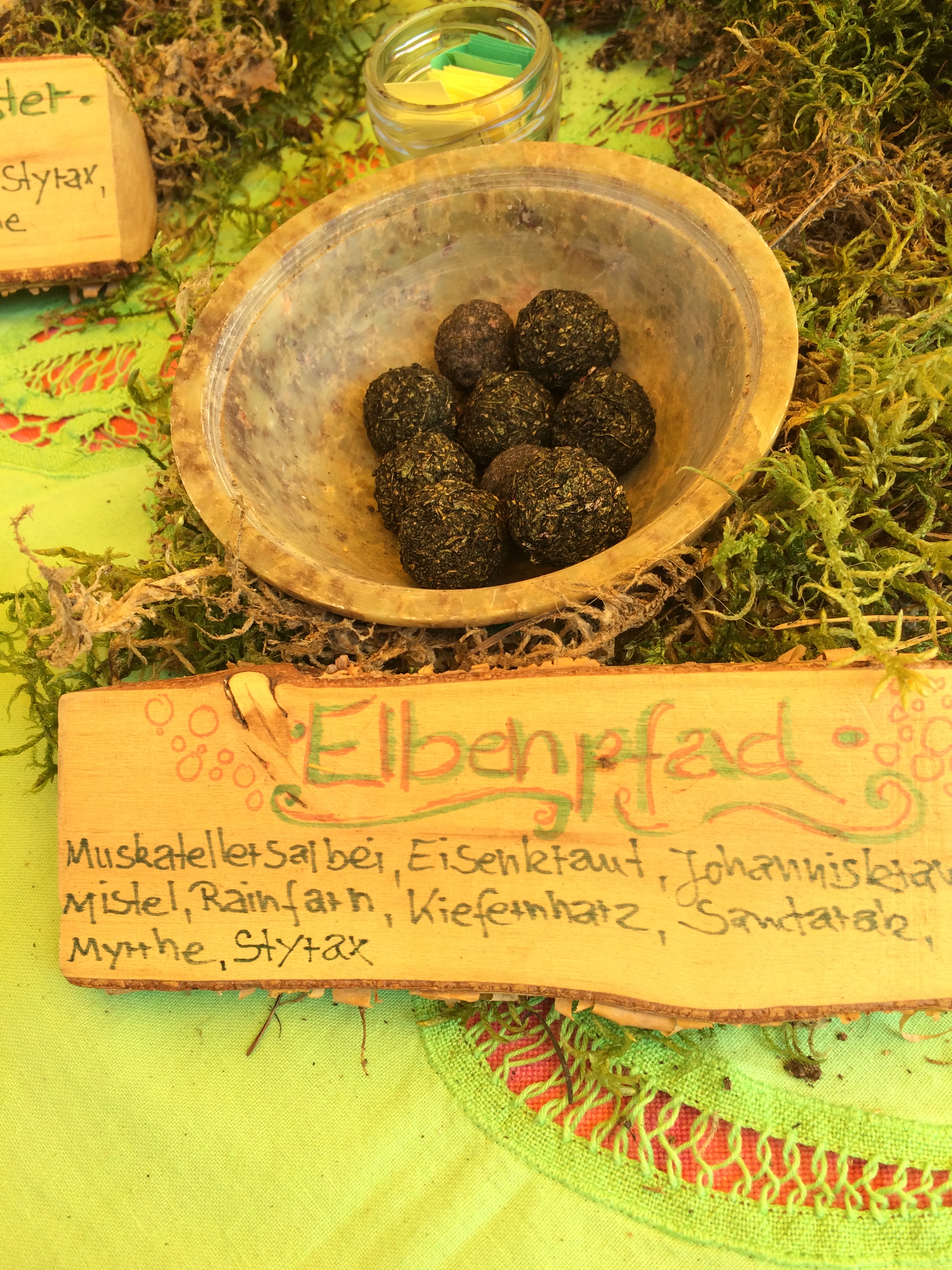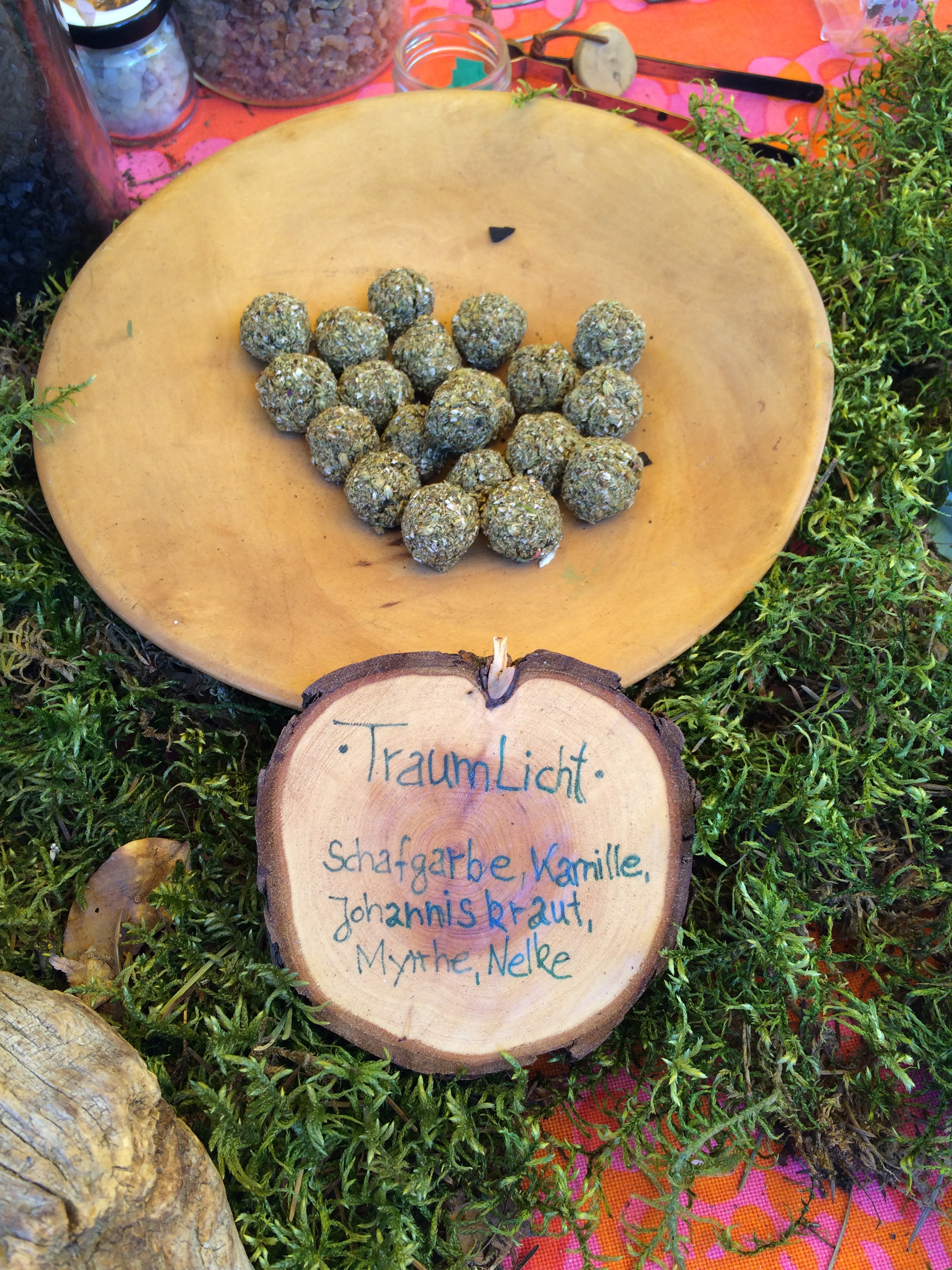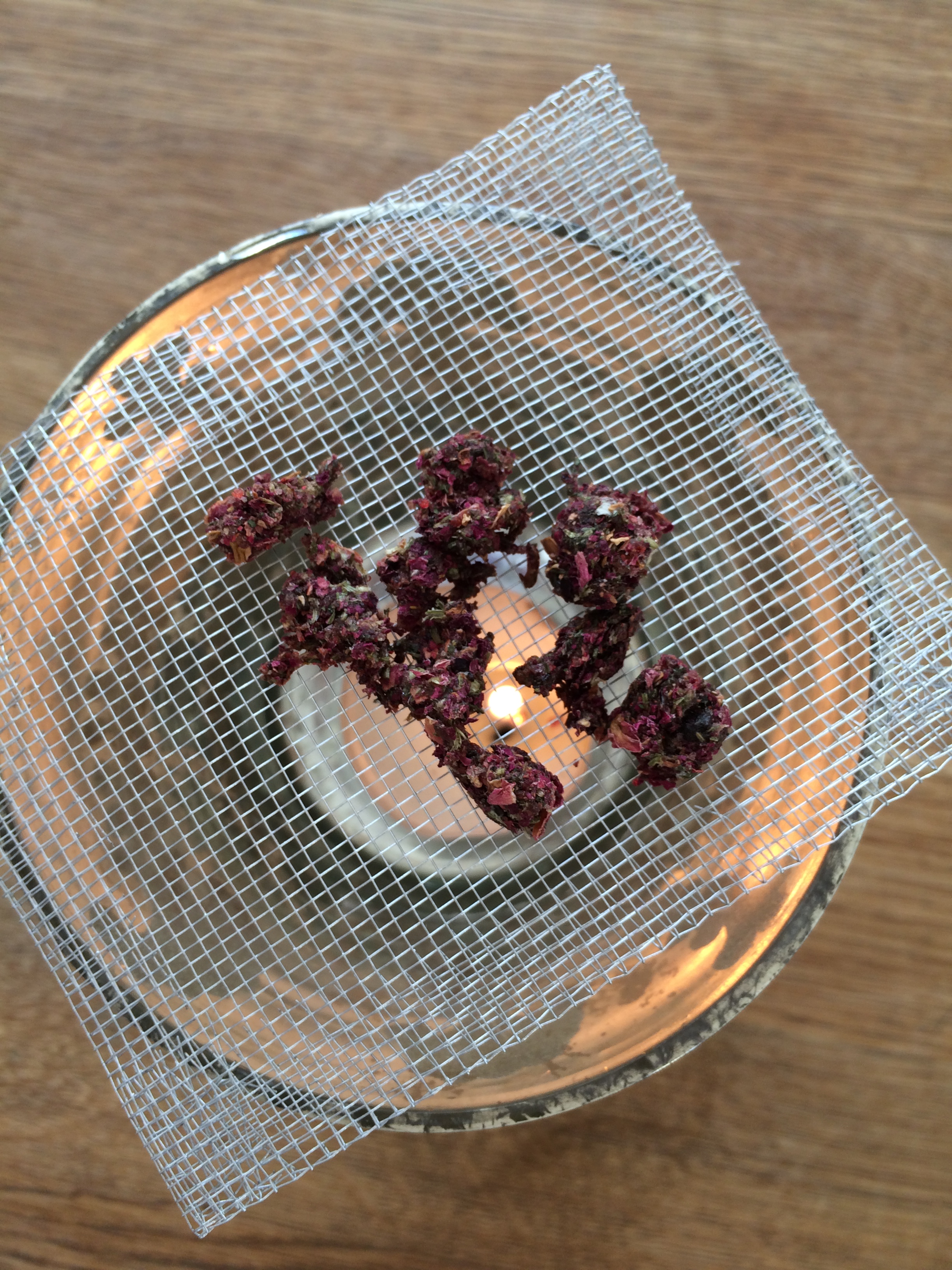 Duftend sind auch die Wiesenperlen, die wir gekauft haben. Das sind kleine Kräuterperlen, die auf einen Netz über einem Teelicht verbrabnnt werden und traumhaft duften: