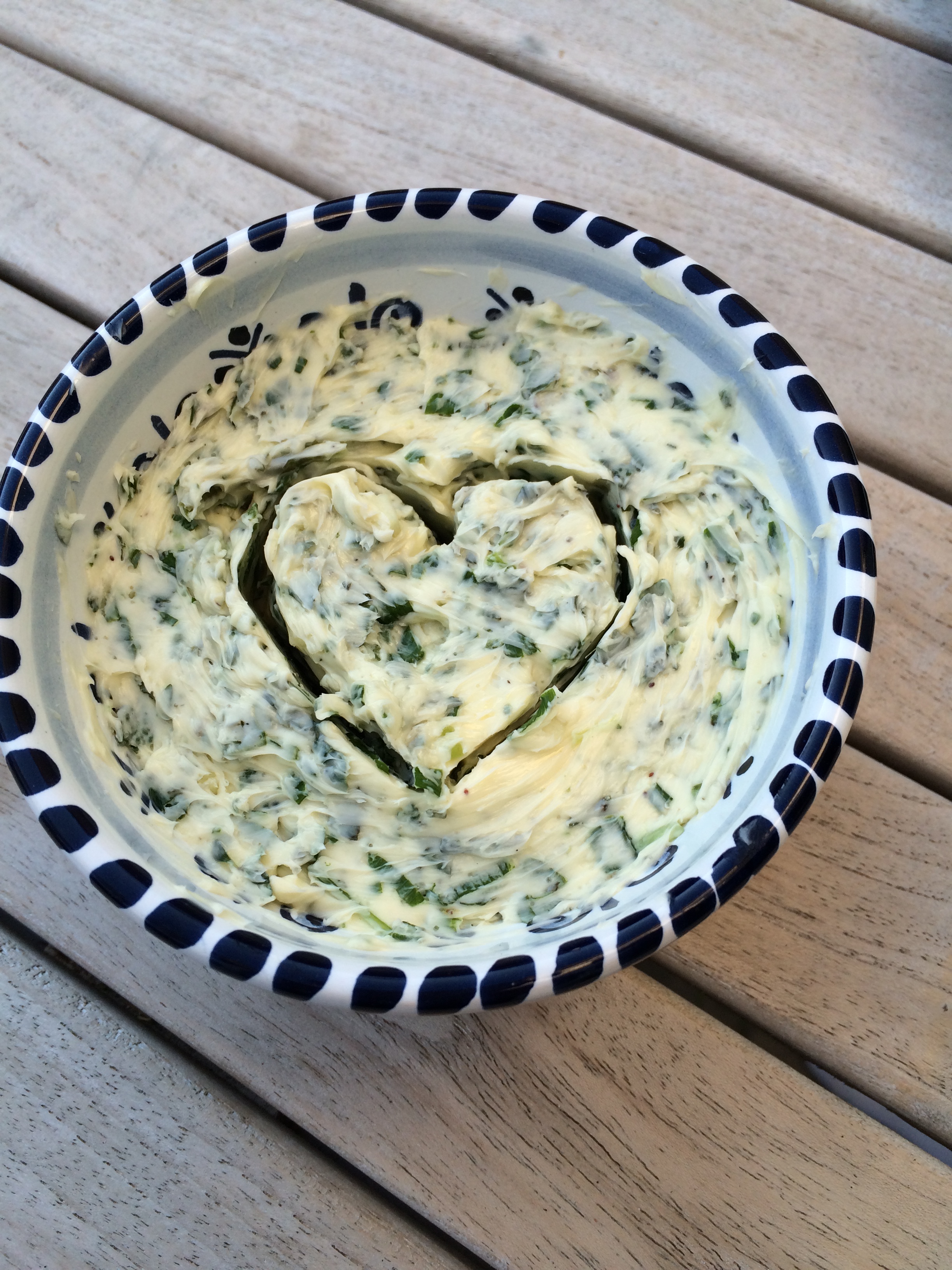 Meine Tochter hat zum Angrillen gestern aus den vielen neuen Kräutern eine Kräuterbutter gemacht – sehr lecker und heute sicher noch besser, aber leider nicht mehr so hübsch…