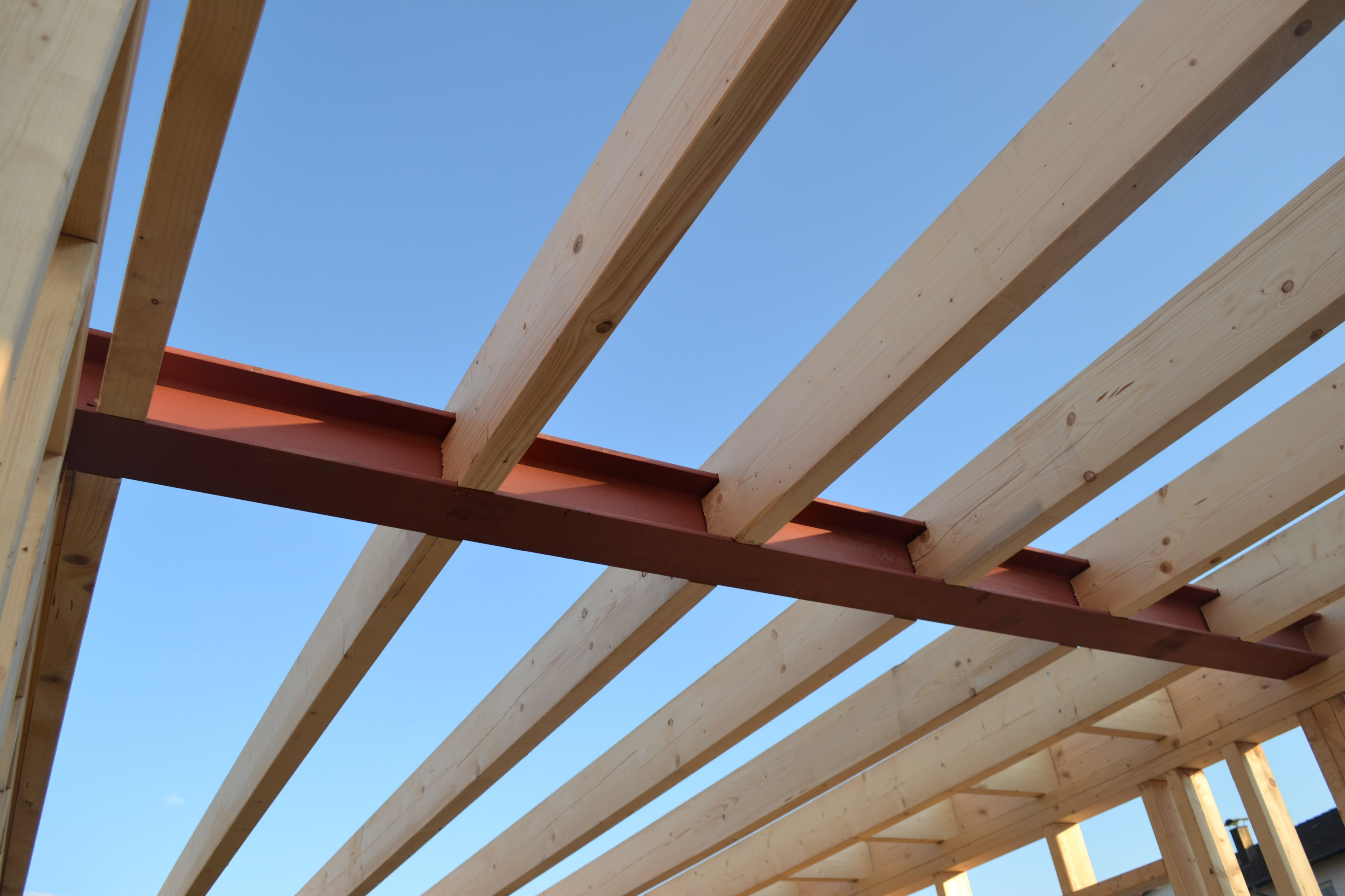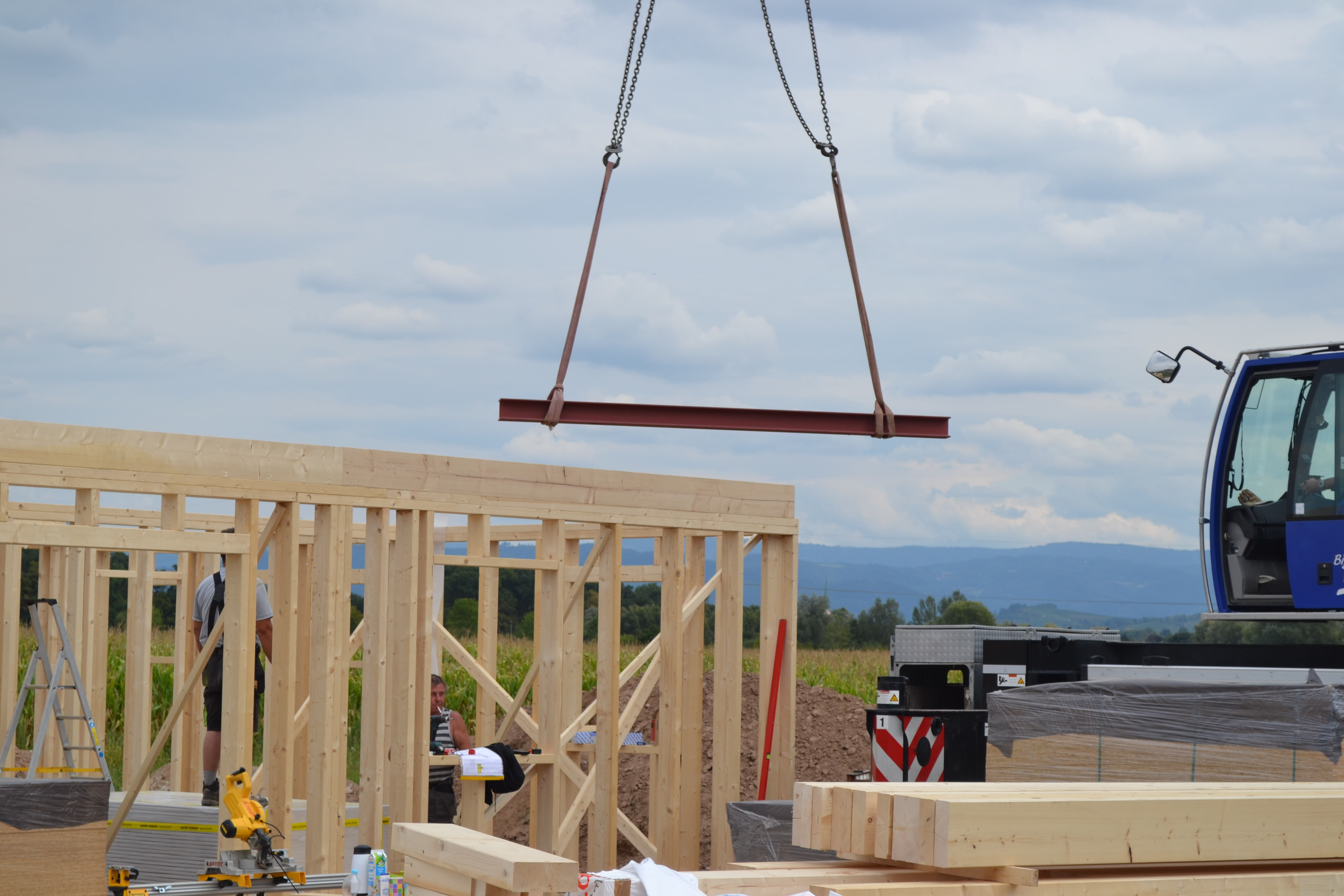 Nun konnte der Stahlträger an Ort und Stelle gehoben werden und auch die Gipskarton- und OSB-Platten und die Balken für die Zwischendecke wurden ins Haus verfrachtet. Heute Abend war dann die Zwischendecke fertig für die Belegung mit den OSB-Platten. Dazu dann aber morgen mehr.
