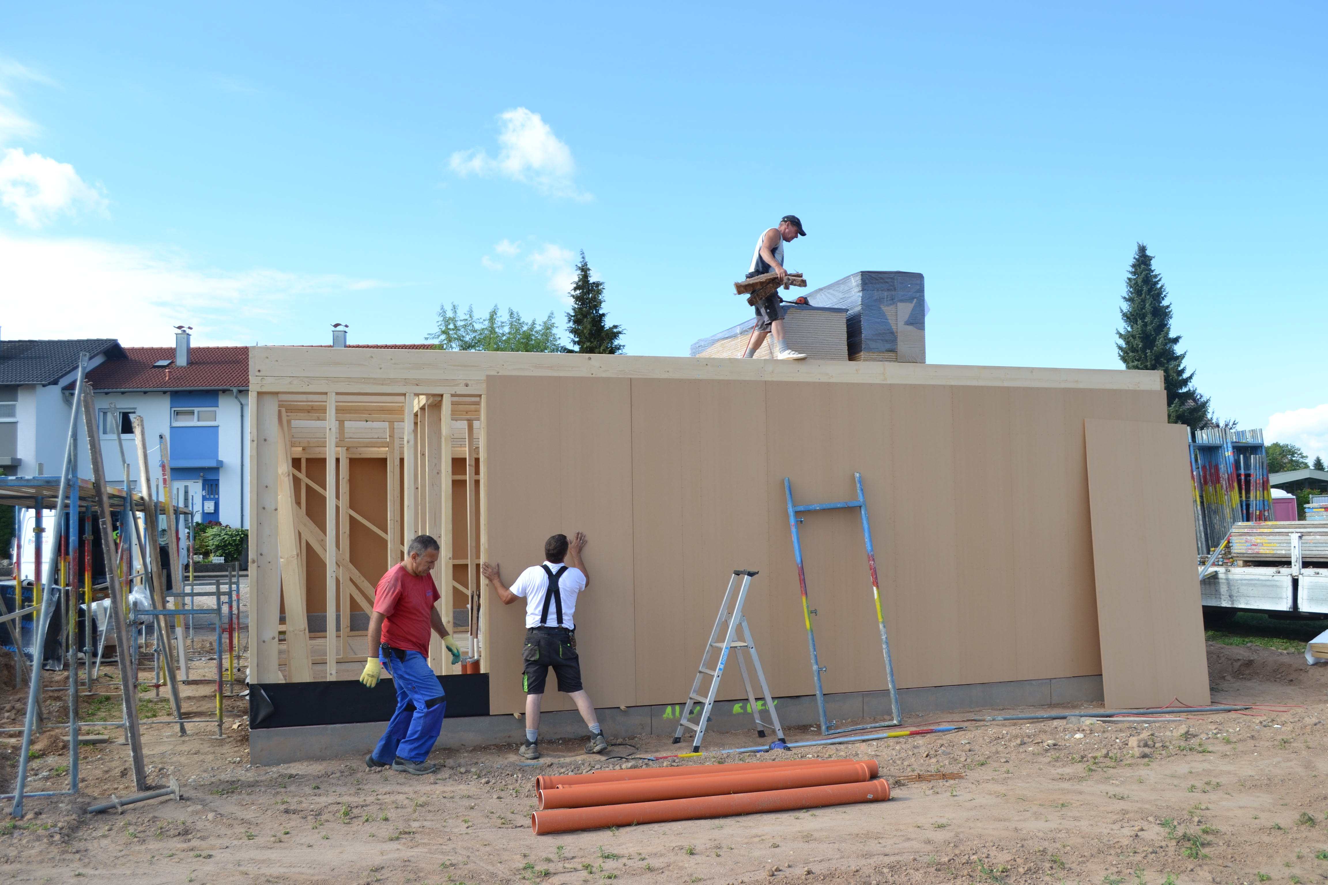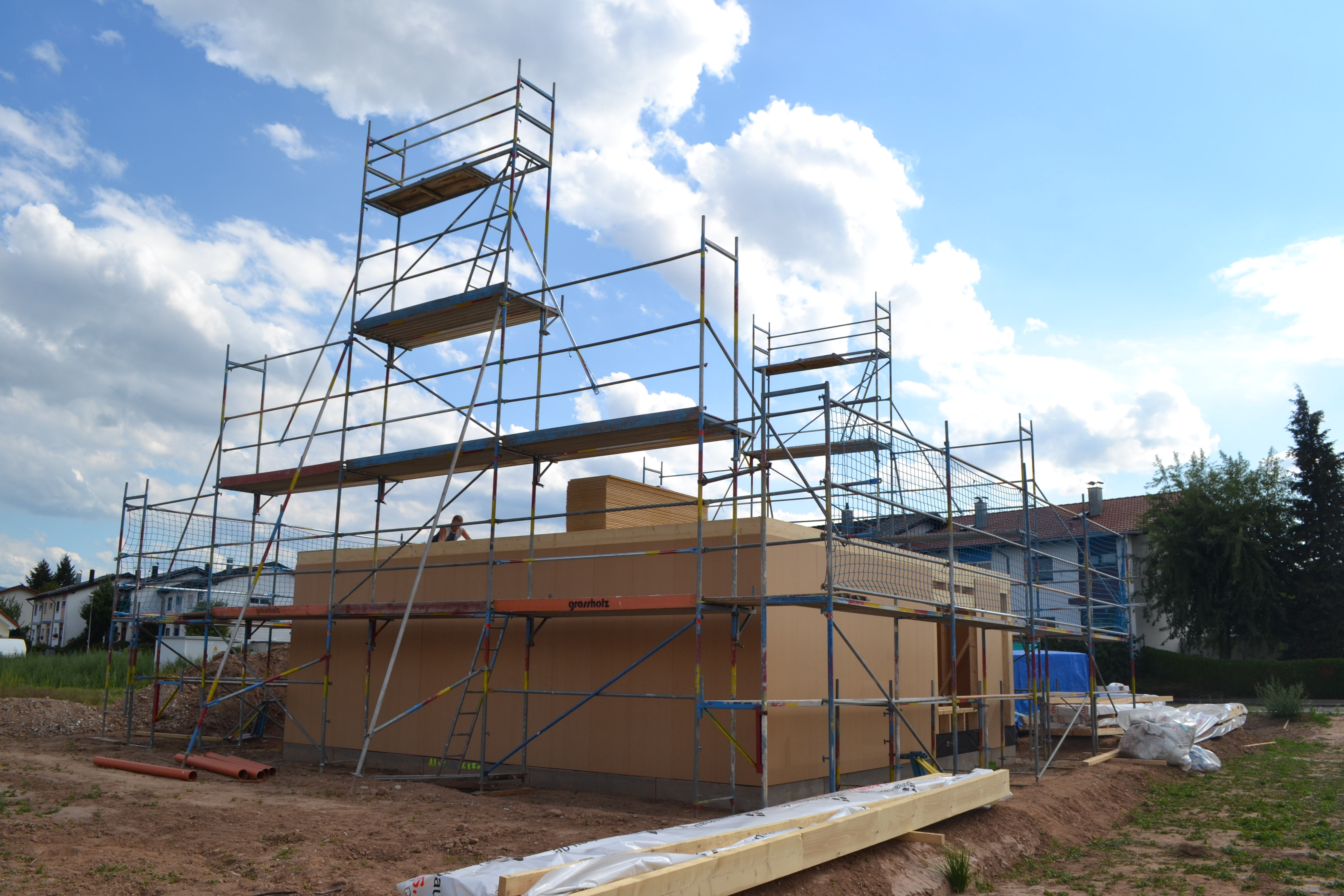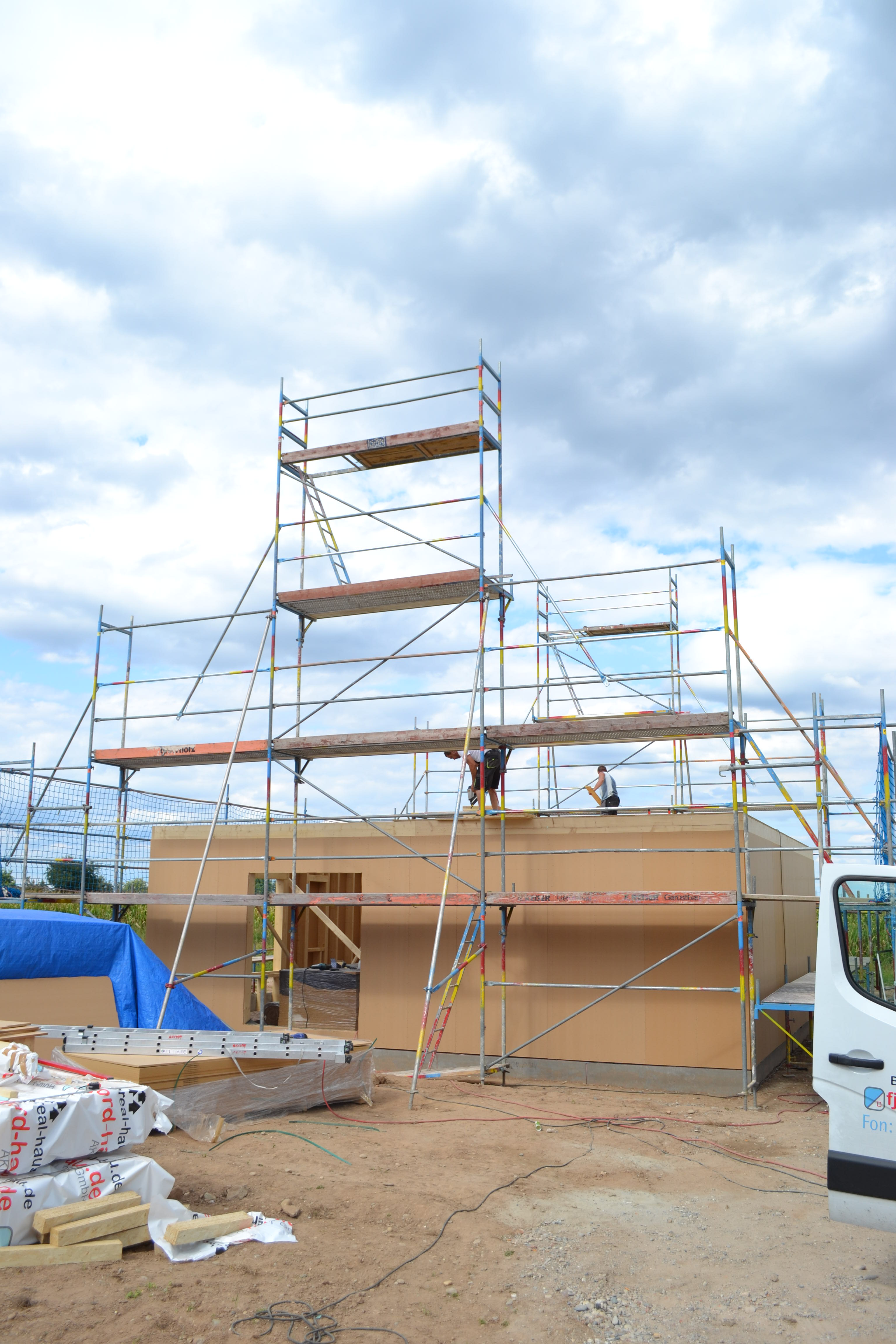 Heute ging es aufwärts – die Gerüstbauer waren da und haben das Gerüst gestellt. Jetzt kann man die spätere Form erkennen und mir wurde ein bisschen mulmig bei dem Gedanken, dass ich da oben rauf muss, um das Haus zu streichen.