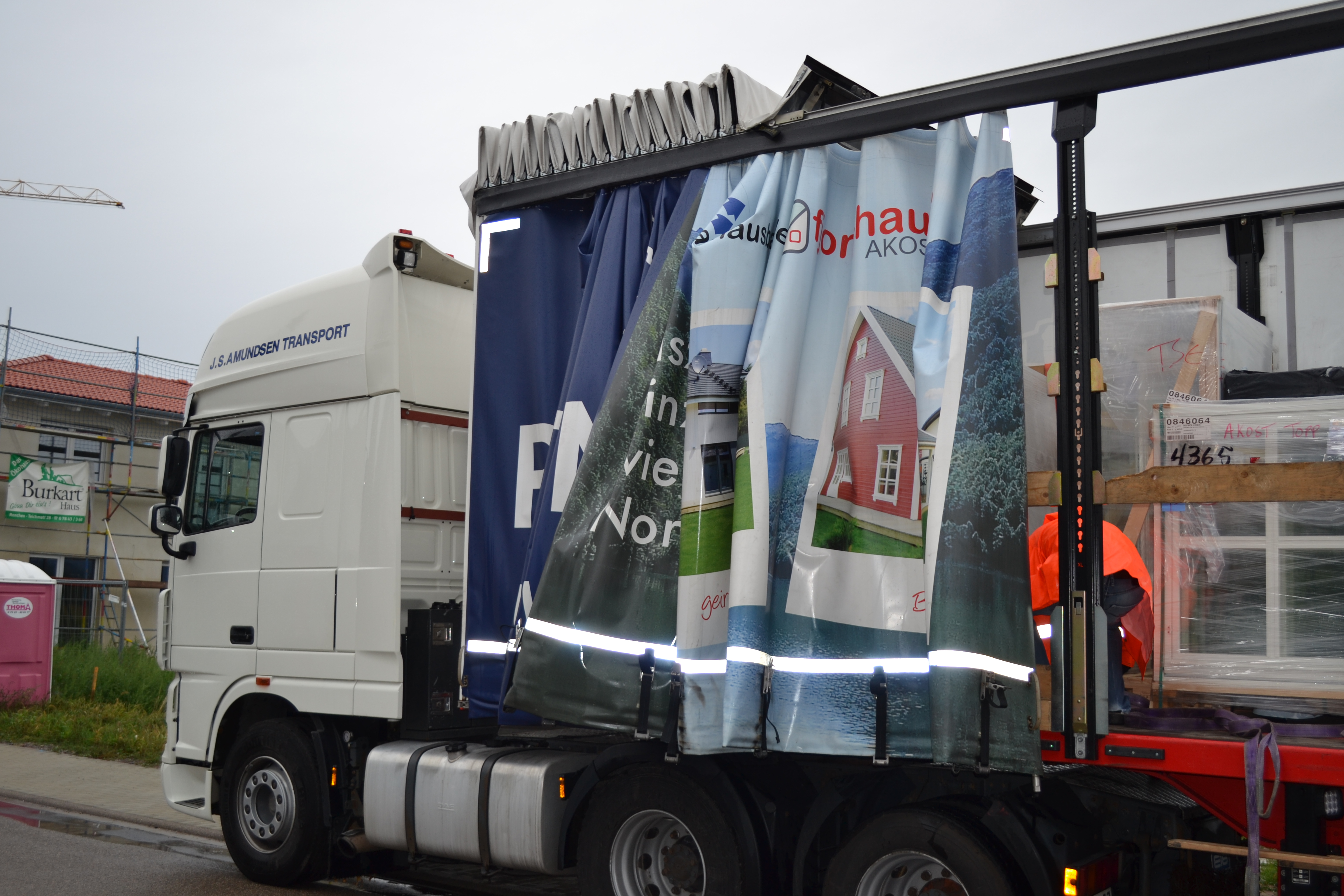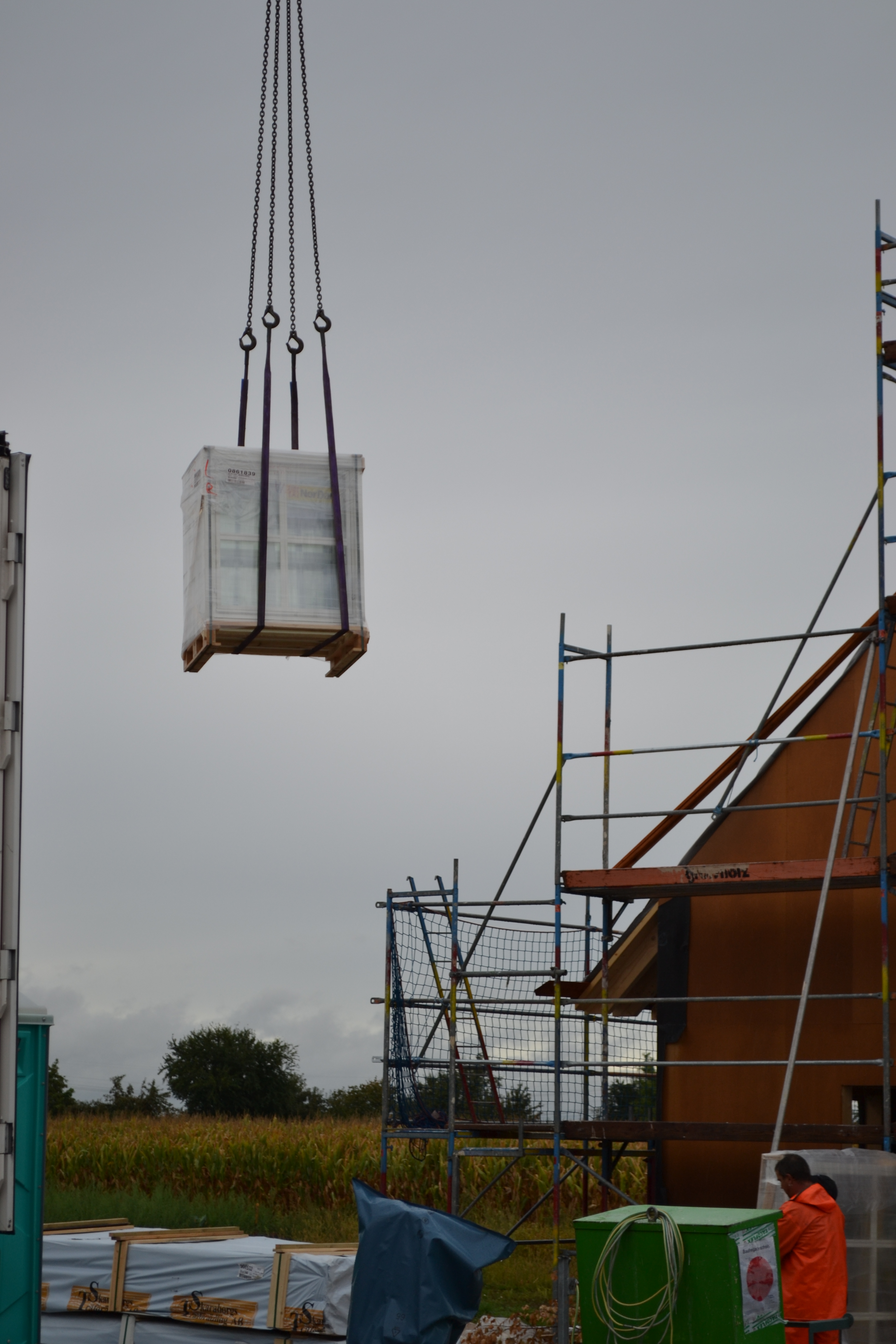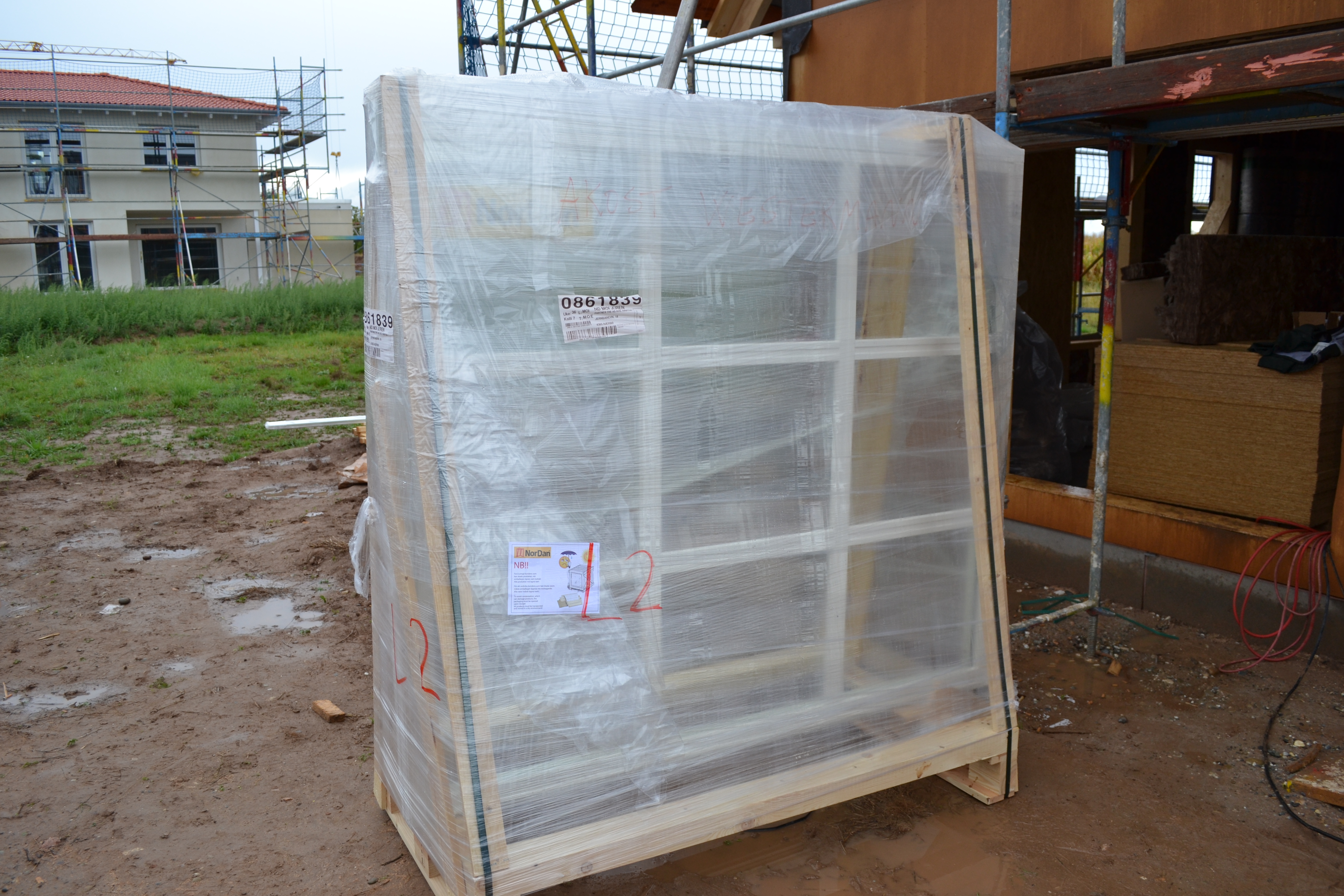 In strömendem Regen erreichte uns gestern der LKW aus Norwegen und brachte die bisher schönste Lieferung – unsere Fenster! Ich bin ganz verliebt in die schönen Sprossen und finde, dass es unserem Haus tatsächlich so etwas wie Augen gibt: