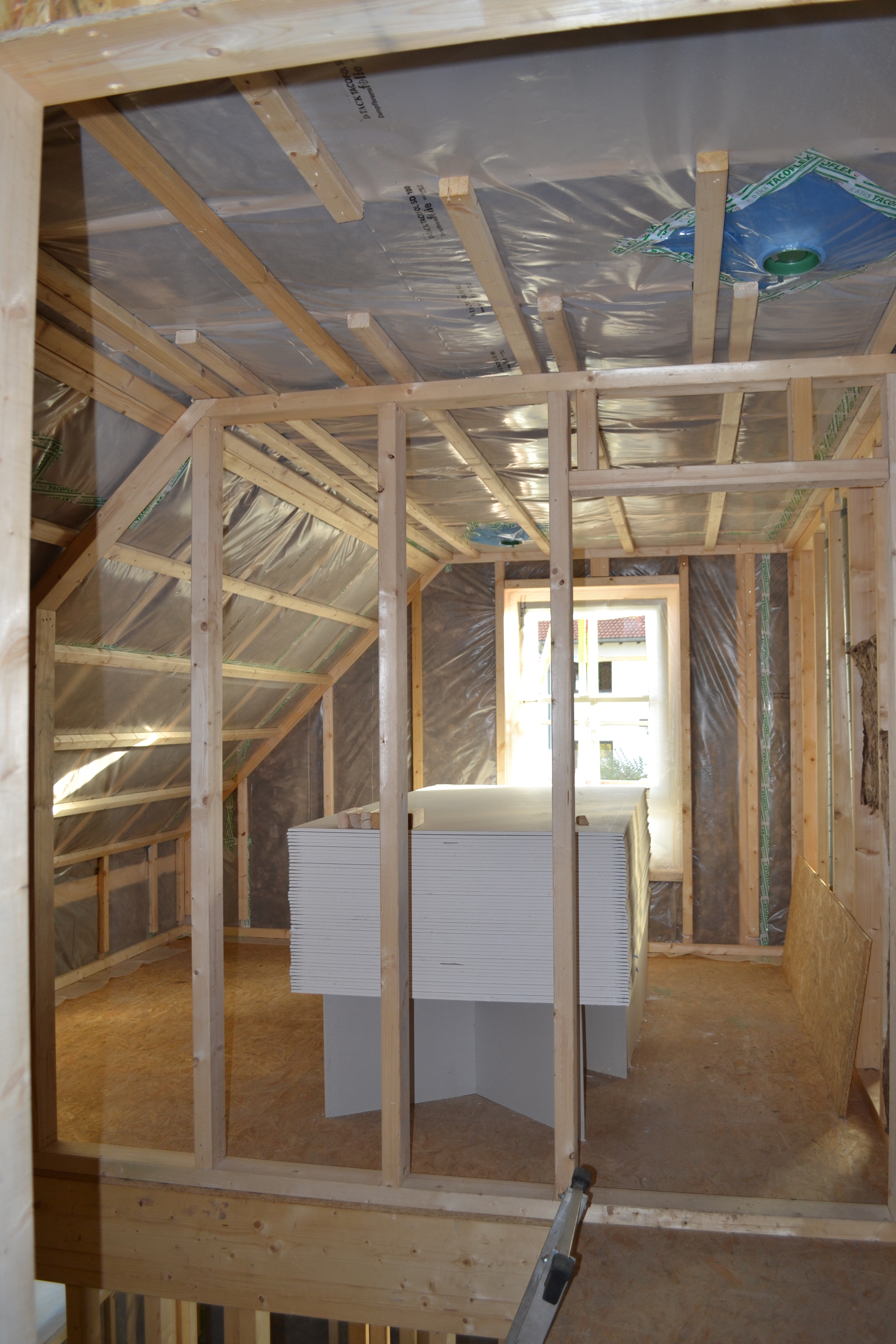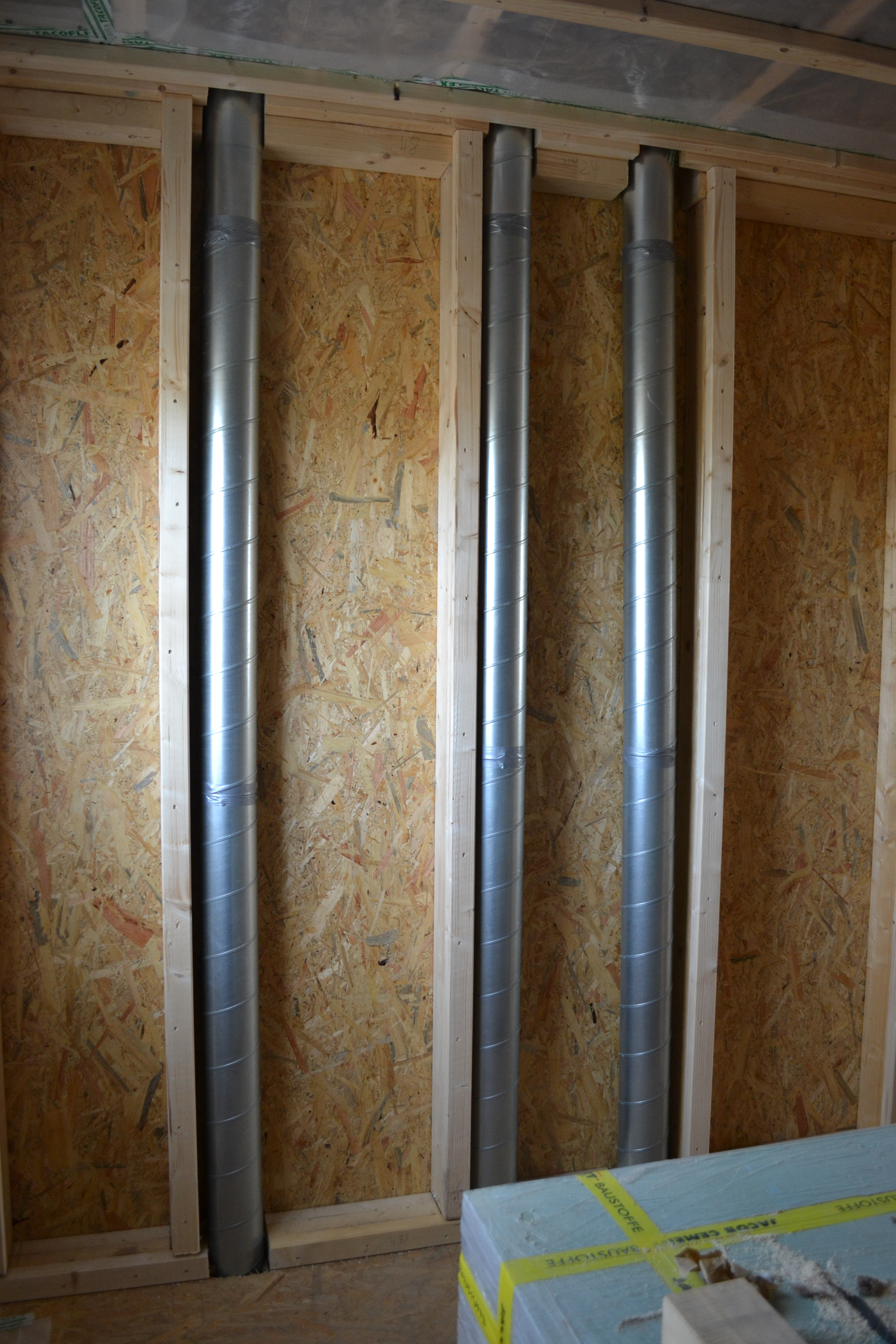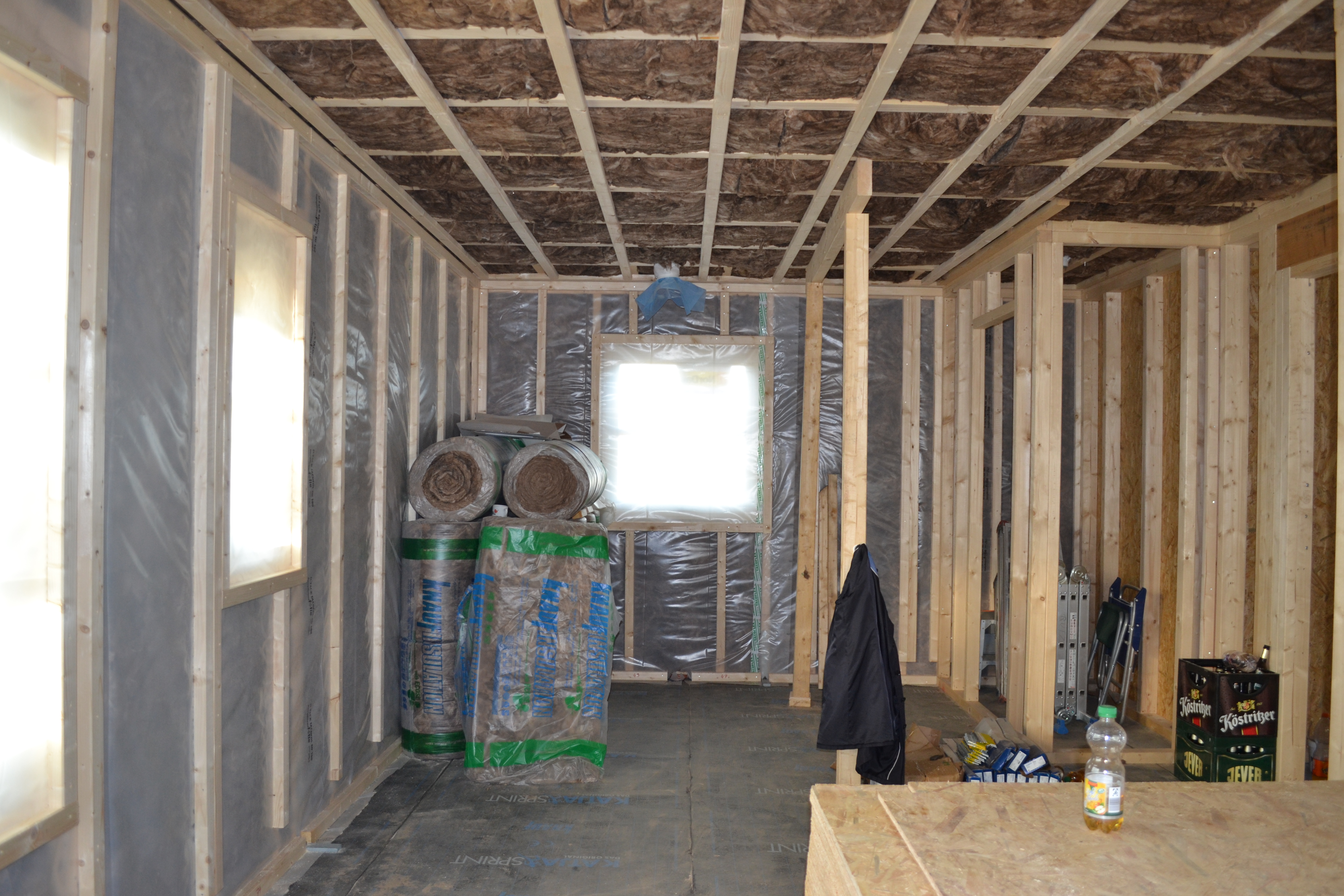 Innen ist die Wand bereit für die Sanitär- und Elektroinstallation. Die Lüftung ist eingebaut und die meisten Wände eingezogen. Die Innenausbauer haben sich heute auf den Weg ins Wochenende und den Urlaub gemacht. Am 5.10. kommen René und Daniel aber wieder.