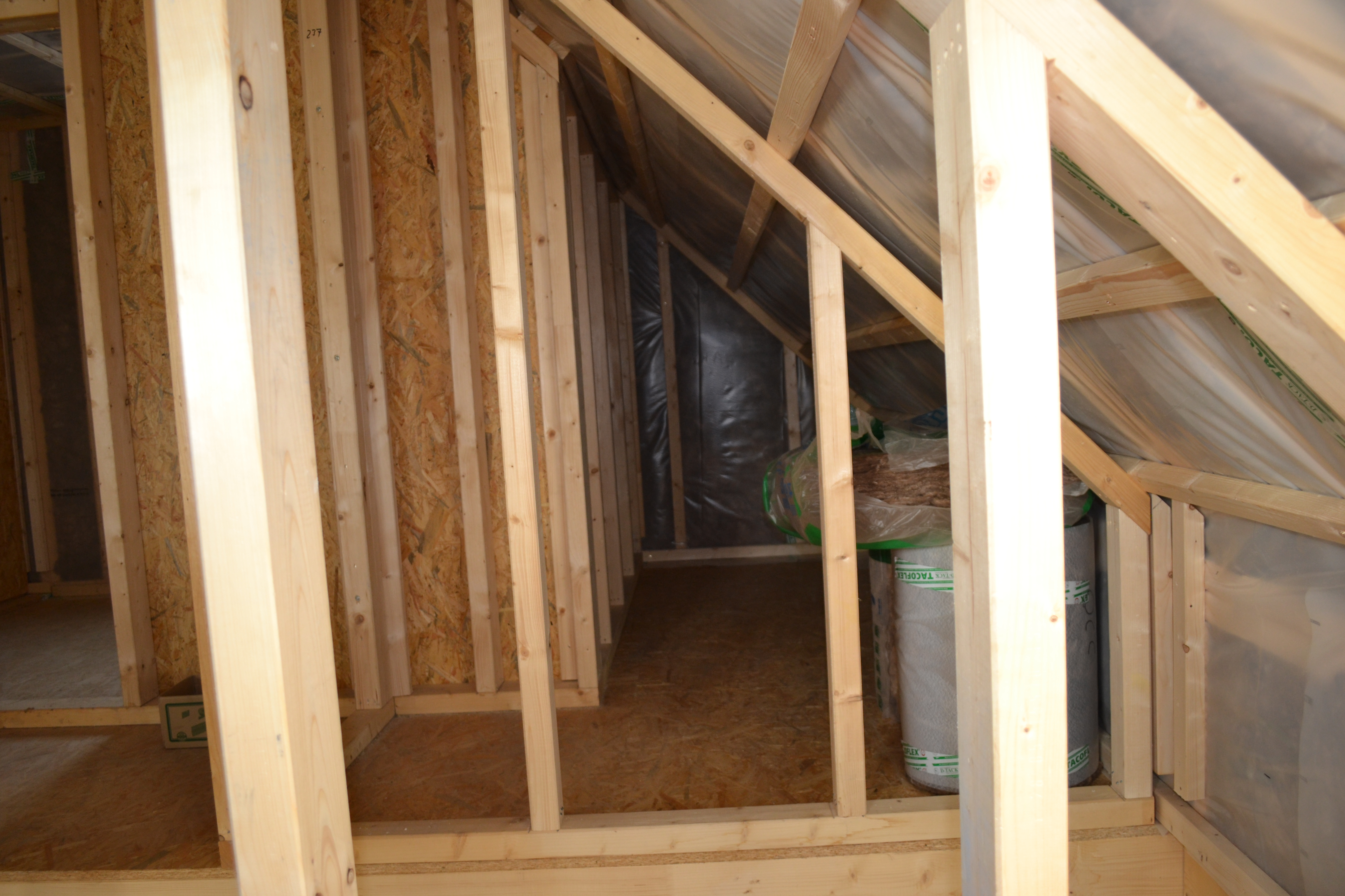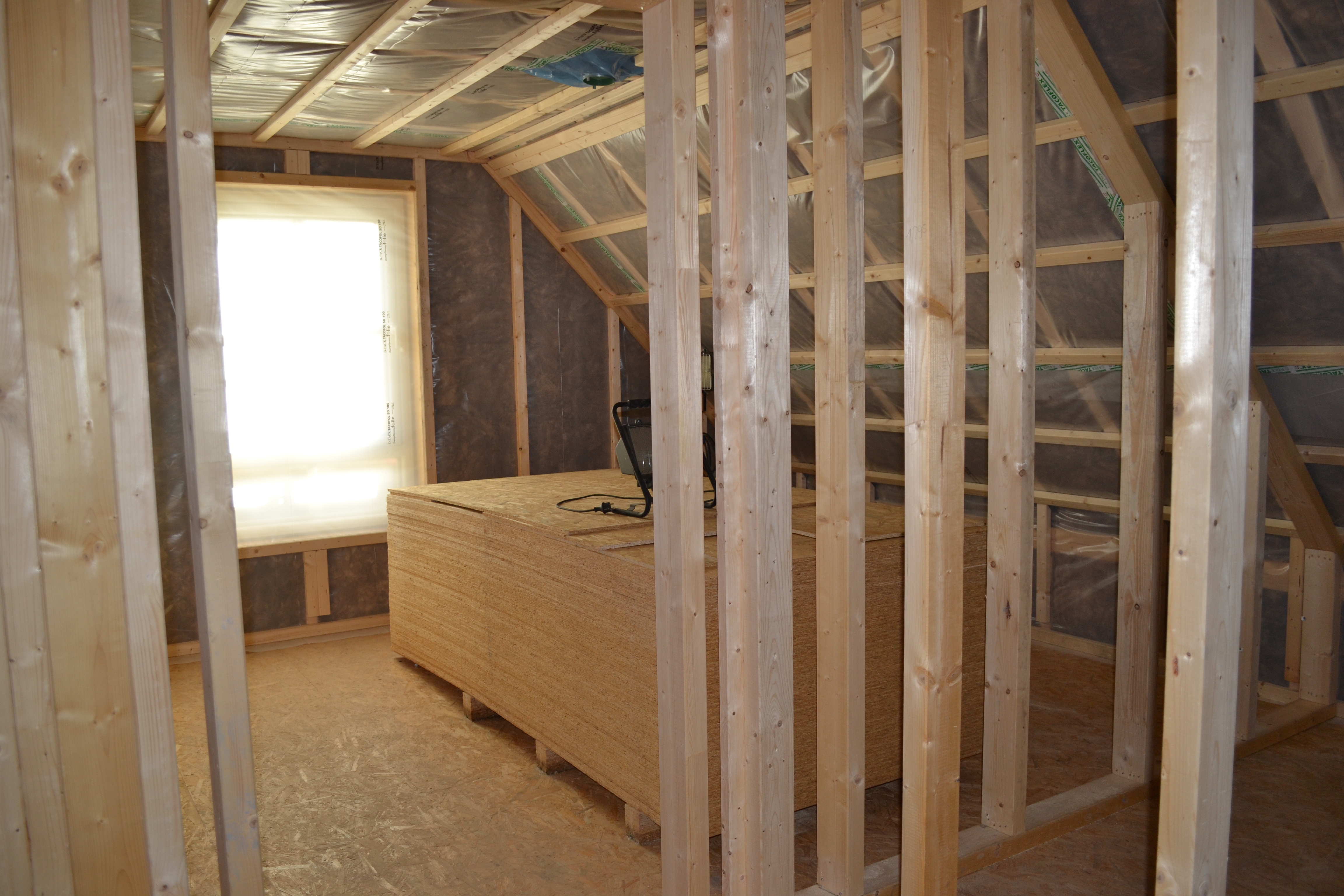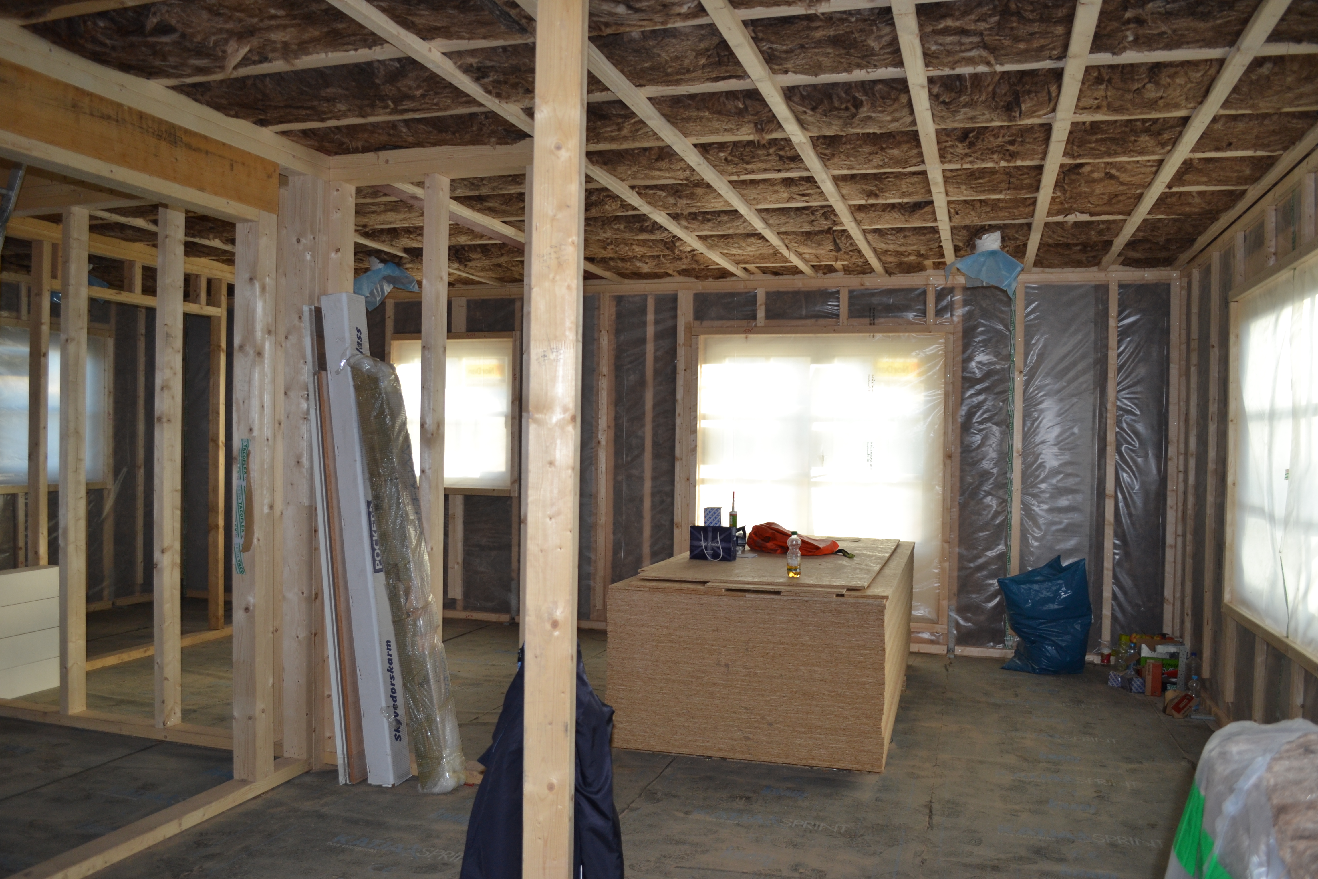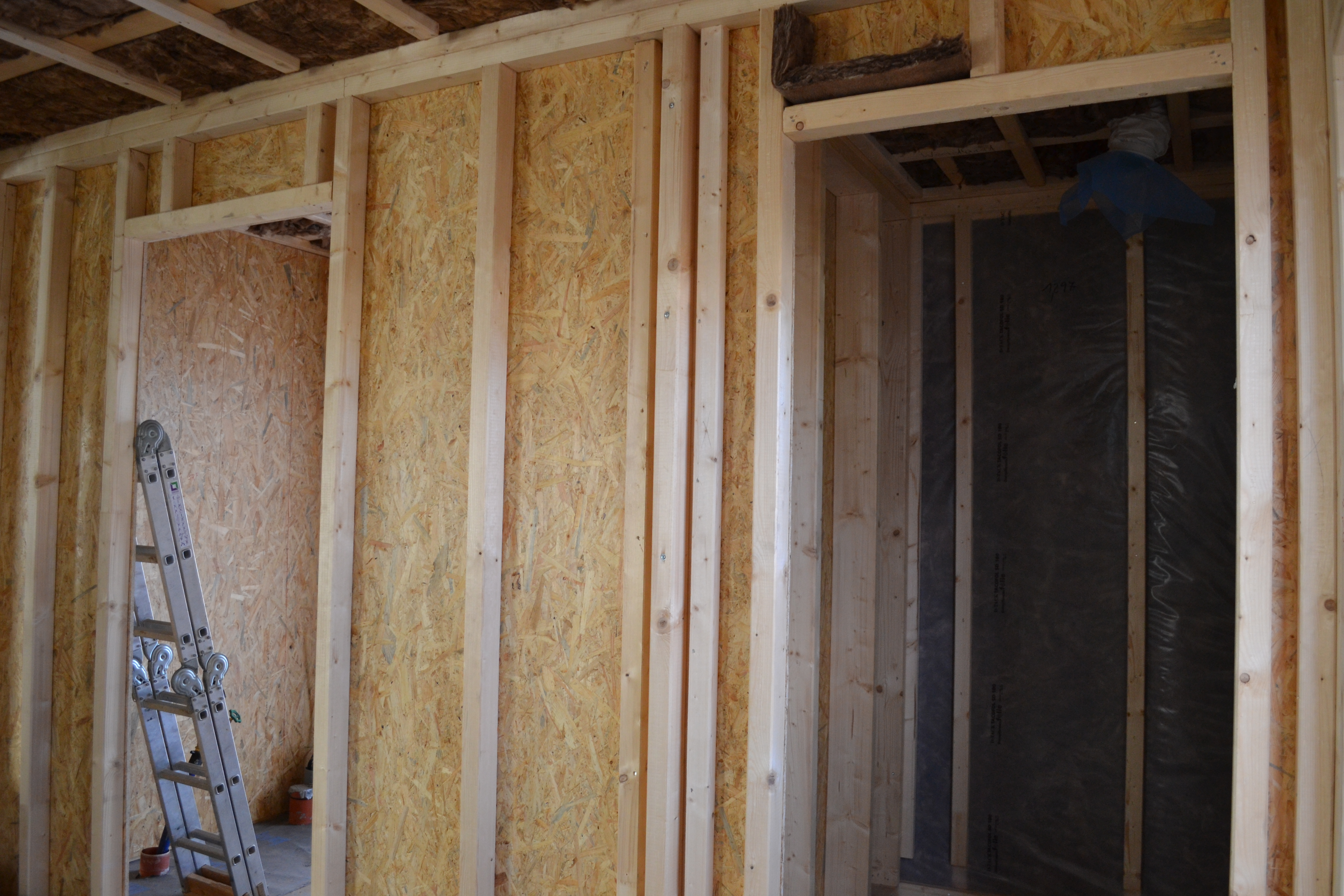 Innen ist die Wand bereit für die Sanitär- und Elektroinstallation. Die Lüftung ist eingebaut und die meisten Wände eingezogen. Die Innenausbauer haben sich heute auf den Weg ins Wochenende und den Urlaub gemacht. Am 5.10. kommen René und Daniel aber wieder.