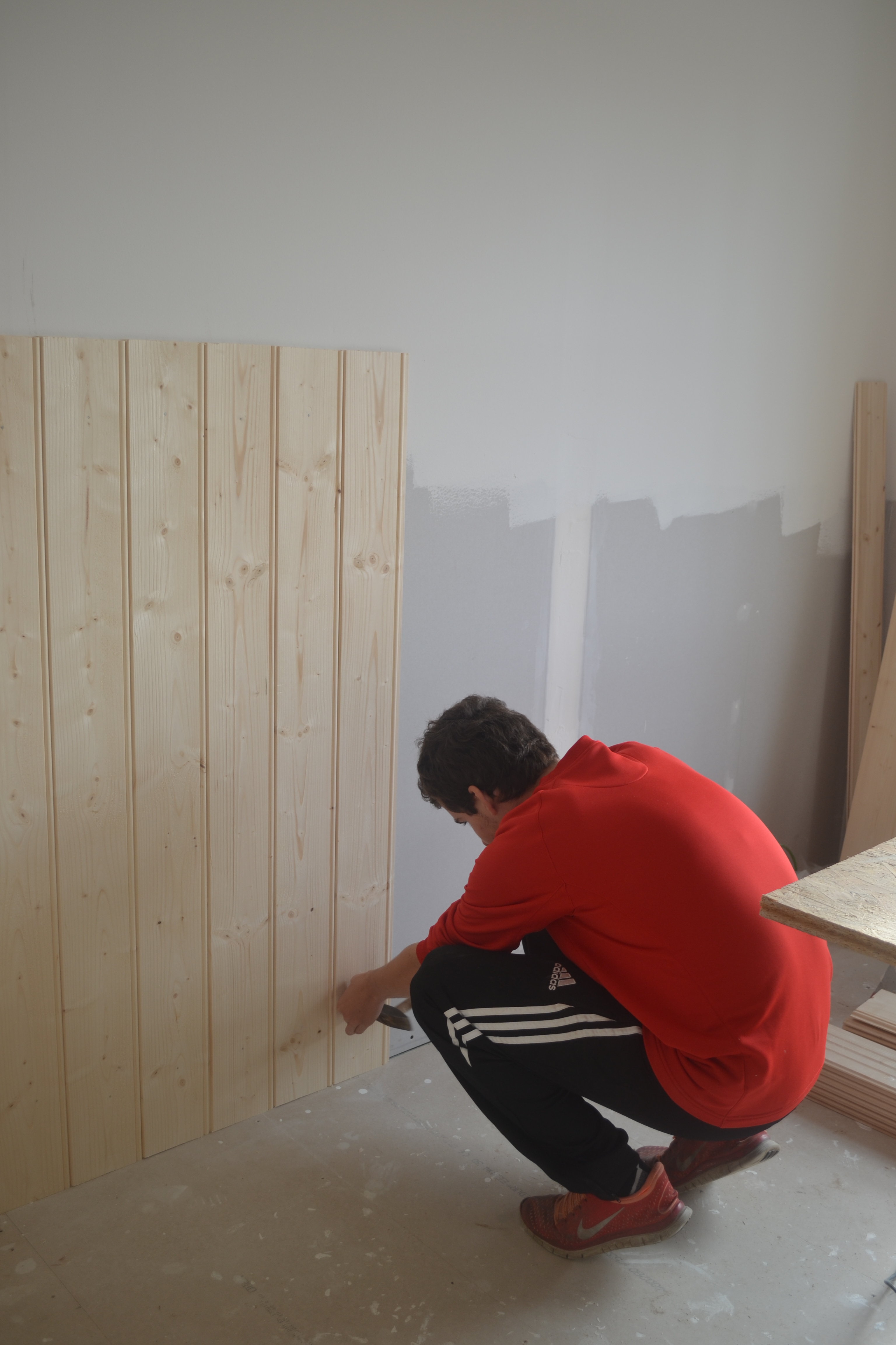Die Holzverkleidung wird weiß gestrichen. Eigentlich sollten wir damit auch warten, weil das Holz noch arbeitet. Aber wir werden es zumindest einmal streichen, bevor der Boden reinkommt. Habt Ihr schon einen Liefertermin fürs Haus?