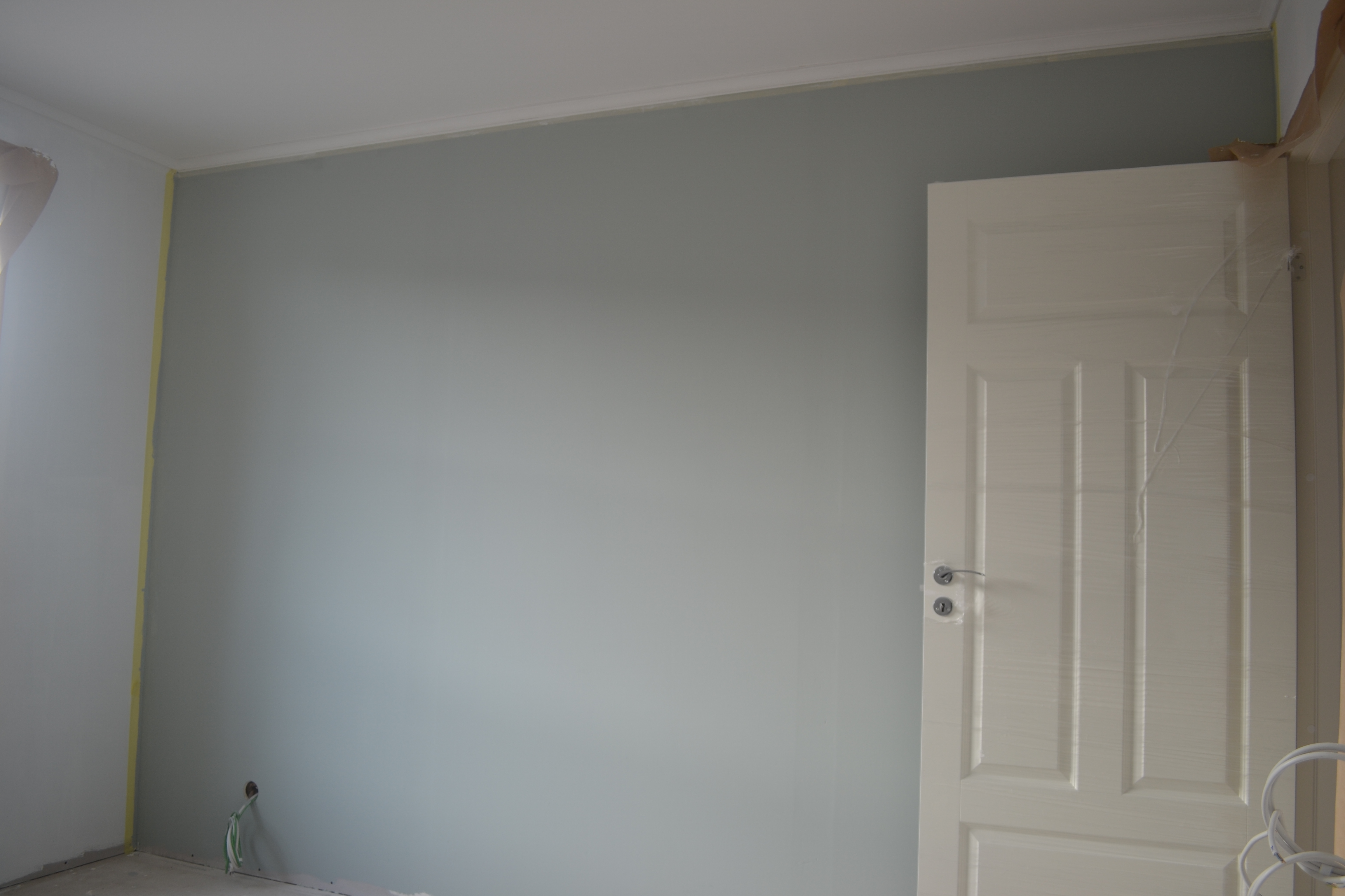 In den letzten Tagen haben wir weiter grundiert und immer wieder Stellen entdeckt, an denen wir noch nachspachteln und schleifen mussten. Es ist schon sehr mysteriös, wie praktisch über Nacht Kratzer in die Gipsmasse kommen… Ich habe aber auch angefangen, oben zu streichen. Die Kinderzimmer sind fertig, nur bei Carlota wird gerade noch die Holzverkleidung angebracht. Ich habe nach der Grundierung (die teure und die günstige unterscheiden sich praktisch überhaupt nicht) Alpina Natura Weiß aufgetragen. Die Farbe ist gut verträglich und deckt sehr gut. In Maxis Zimmer habe ich eine Wand farbig gestrichen und zwar mit Alpina Feine Farben. Die Farbe heißt „Sanfter Morgentau“ und ist ein schönes Grau-Grün. Im Badezimmer verwende ich „Nebel im November“ aus der selben Farbreihe.